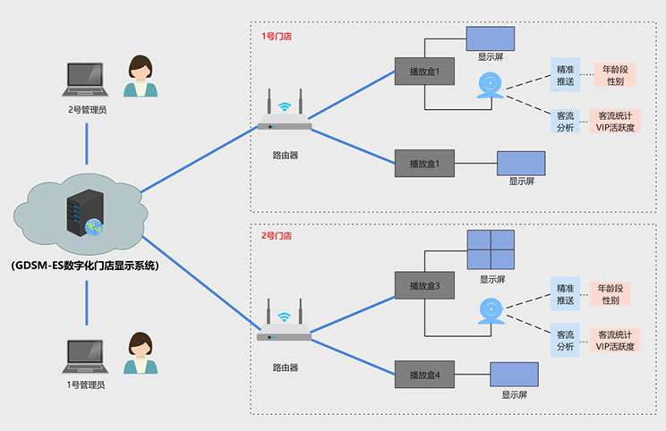 该客户为宁波地区零售门店,在一段时间内,客户发现门店销售额持续下滑,但是不知道原因出在哪里,到底是消费者减少,还是广告推送出现问题,亦或是其他原因,客户没有头绪,非凡娱乐-电子娱乐科技数据化门店显示系统完美的解决了客户痛点,方案拓扑图如下: