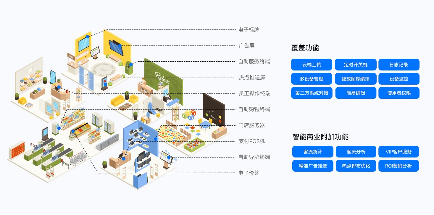 非凡娱乐-电子娱乐智慧零售解决方案搭配非凡娱乐-电子娱乐GDSM-ES智能零售管理系统,为全球零售门店客户提供了功能齐全的数字化运营管理工具,提供广告显示信息编辑、信息发布、AI识别、客户分析和会员管理等功能,实现对设备、内容、营销、运营的综合数智化管理能力,为精准运营管理赋能。