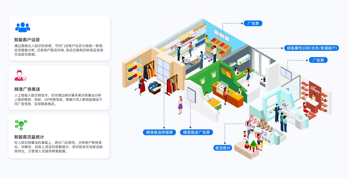 非凡娱乐-电子娱乐GDSM-ES智能零售管理系统还可实现宣传推广内容的精准推送,高效触达。系统融合人工智能技术,采用专业的人脸识别算法,通过终端接入摄像设备与AIOT设备,自动识别不同的物体、动作和行为,形成人物画像,为广告屏幕的内容推送提供数据支持,实现精准营销。同时还可以提供客流统计和客群分析功能,为零售客户提供精准的门店数字化运营管理方案。