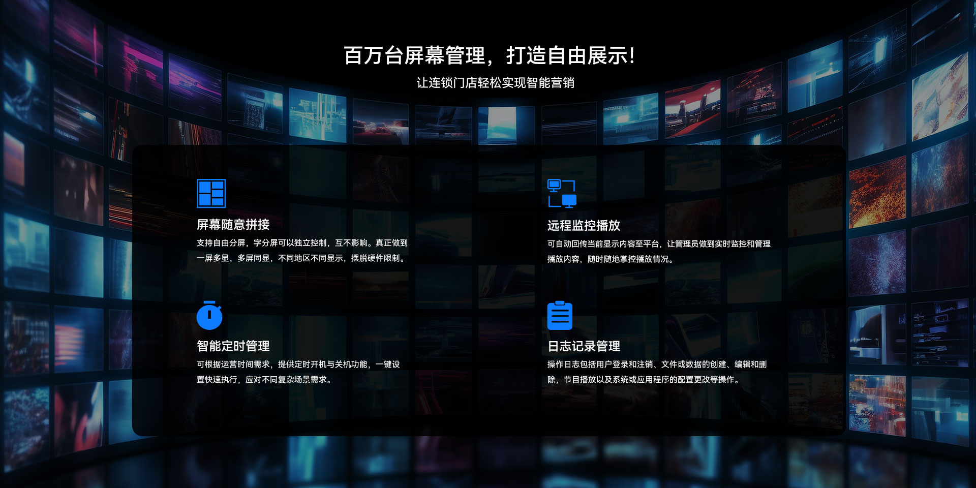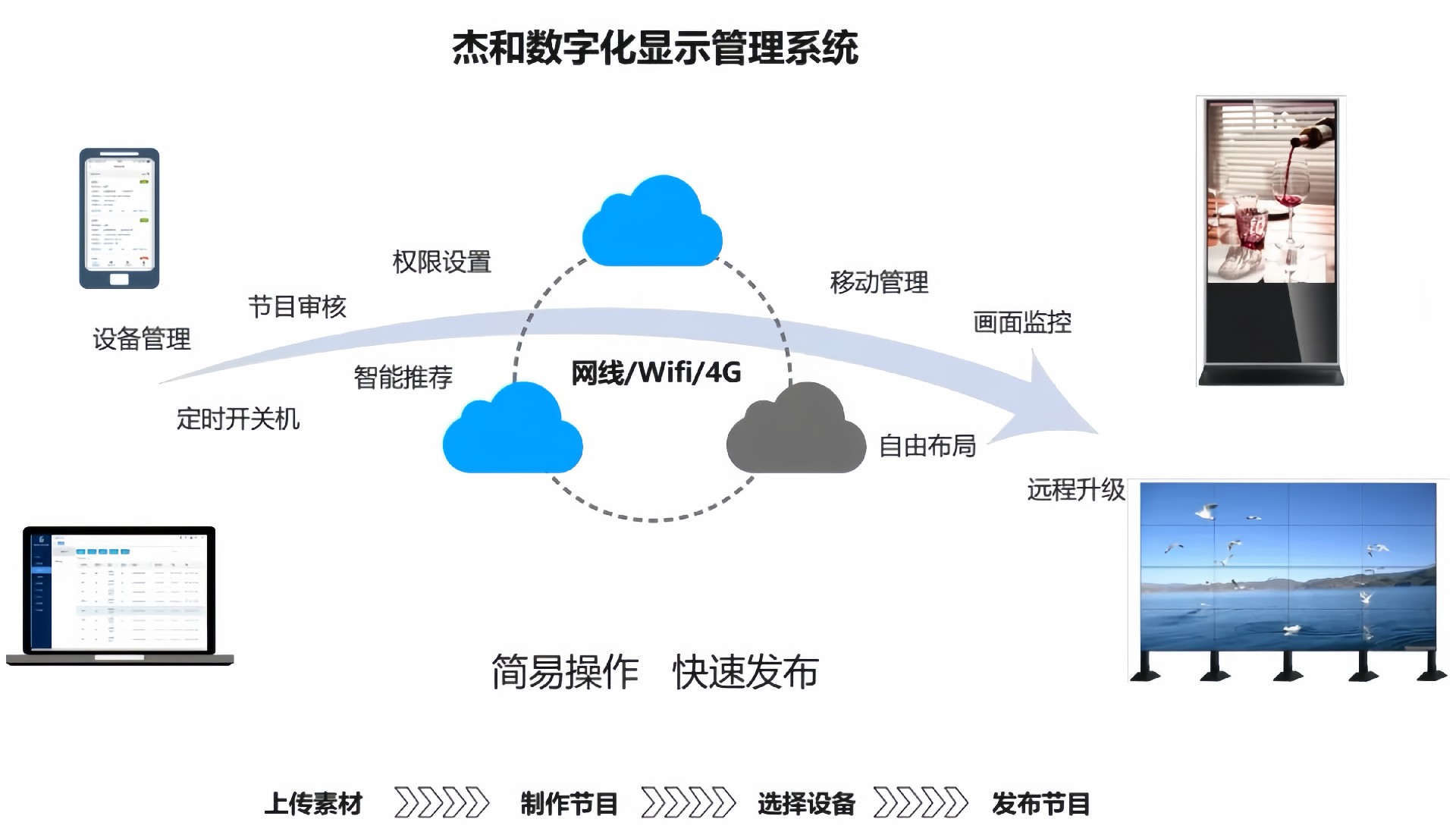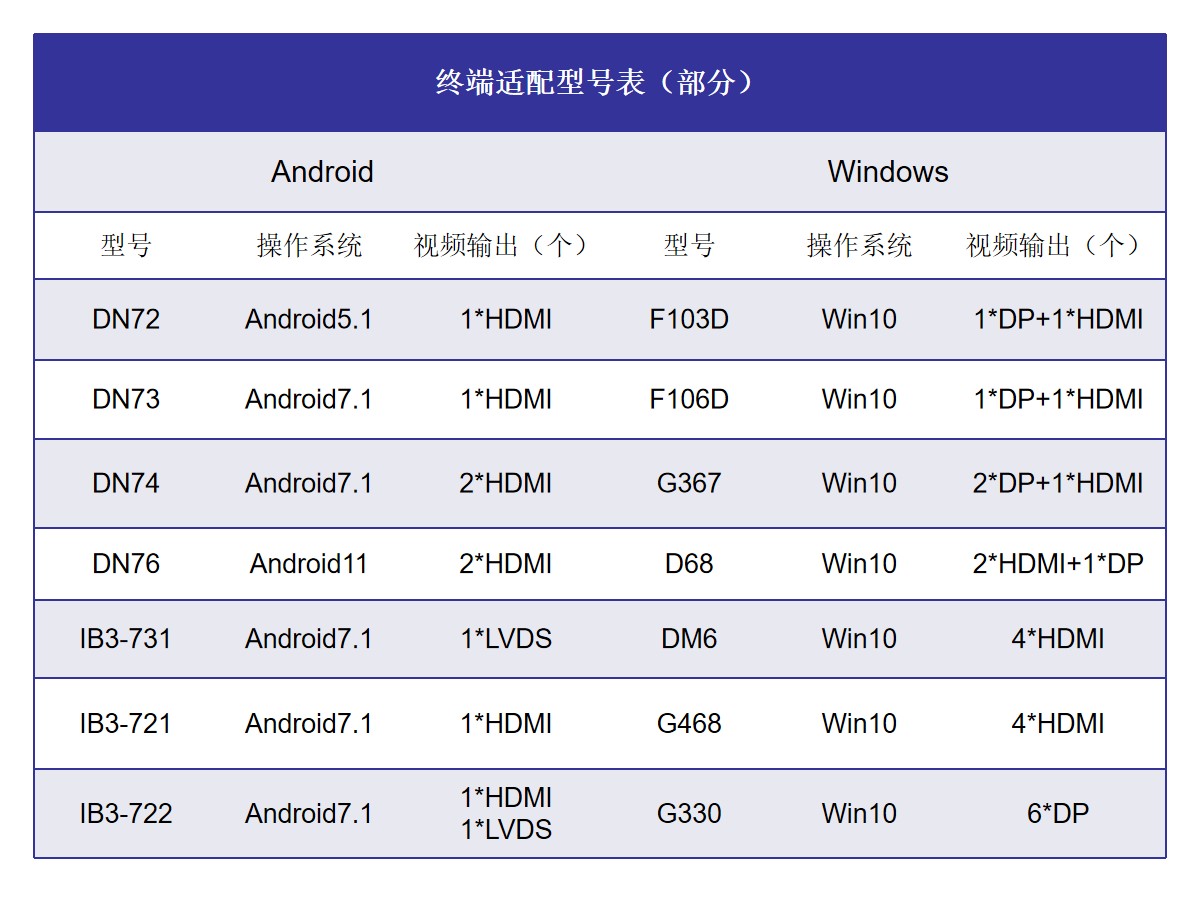 目前非凡娱乐-电子娱乐科技GDSM-ES系统覆盖市场上多形态网络智能显示终端,满足行业全产品业态需求,如广告机、LED显示屏、LCD拼接屏 、普通液晶电视等各种显示终端,广泛用于广告宣传、通知公告、指示引导。