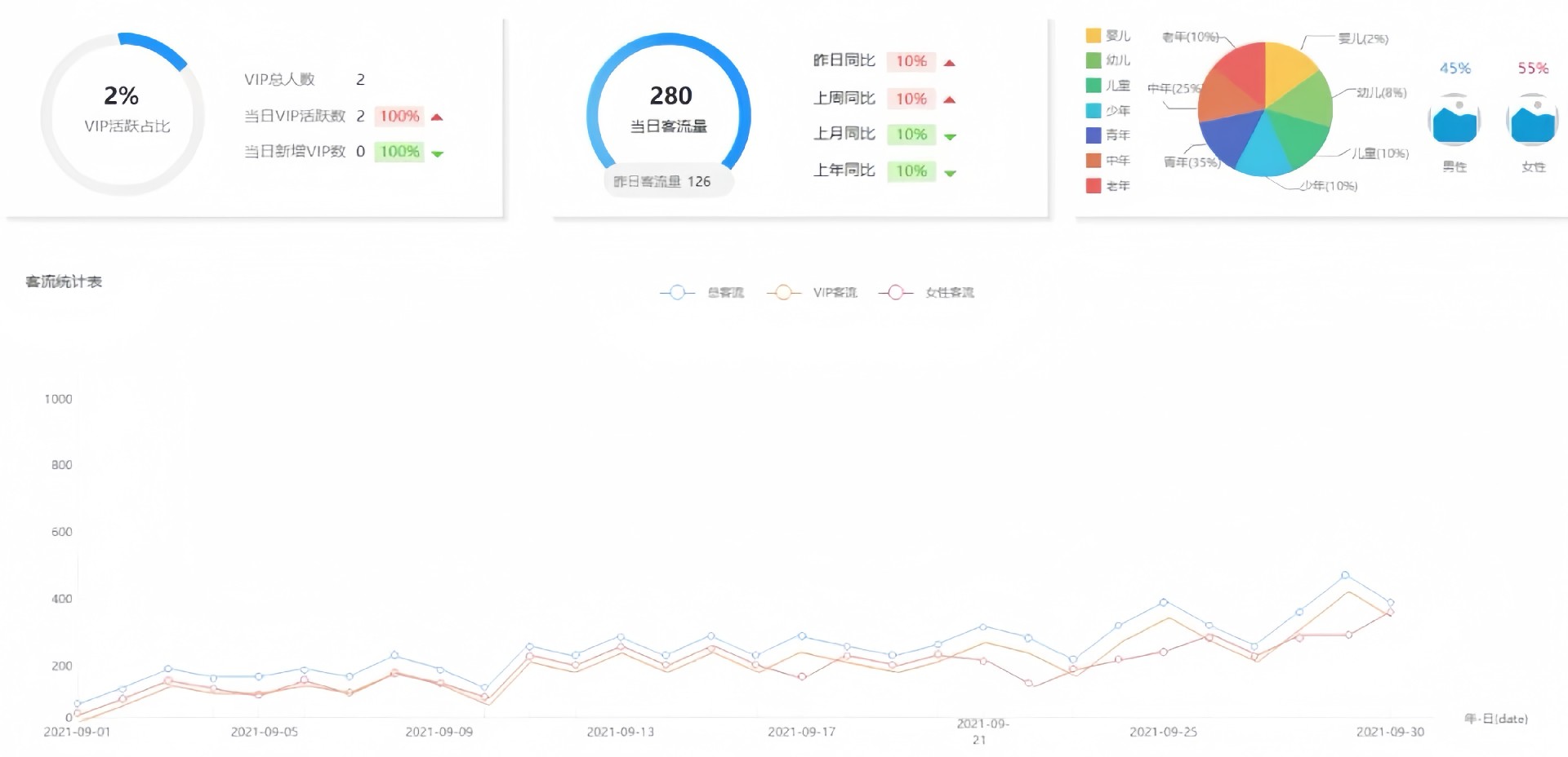 后台还可统计总客流量、不同类型客流占比数、不同周期内客流量变化比例、数据报表导出等,并以饼状图和曲线图直观体现客流量变化情况。帮助商铺实现对客户信息系统化管理,掌握客流变化情况,调整优化运营策略的目标