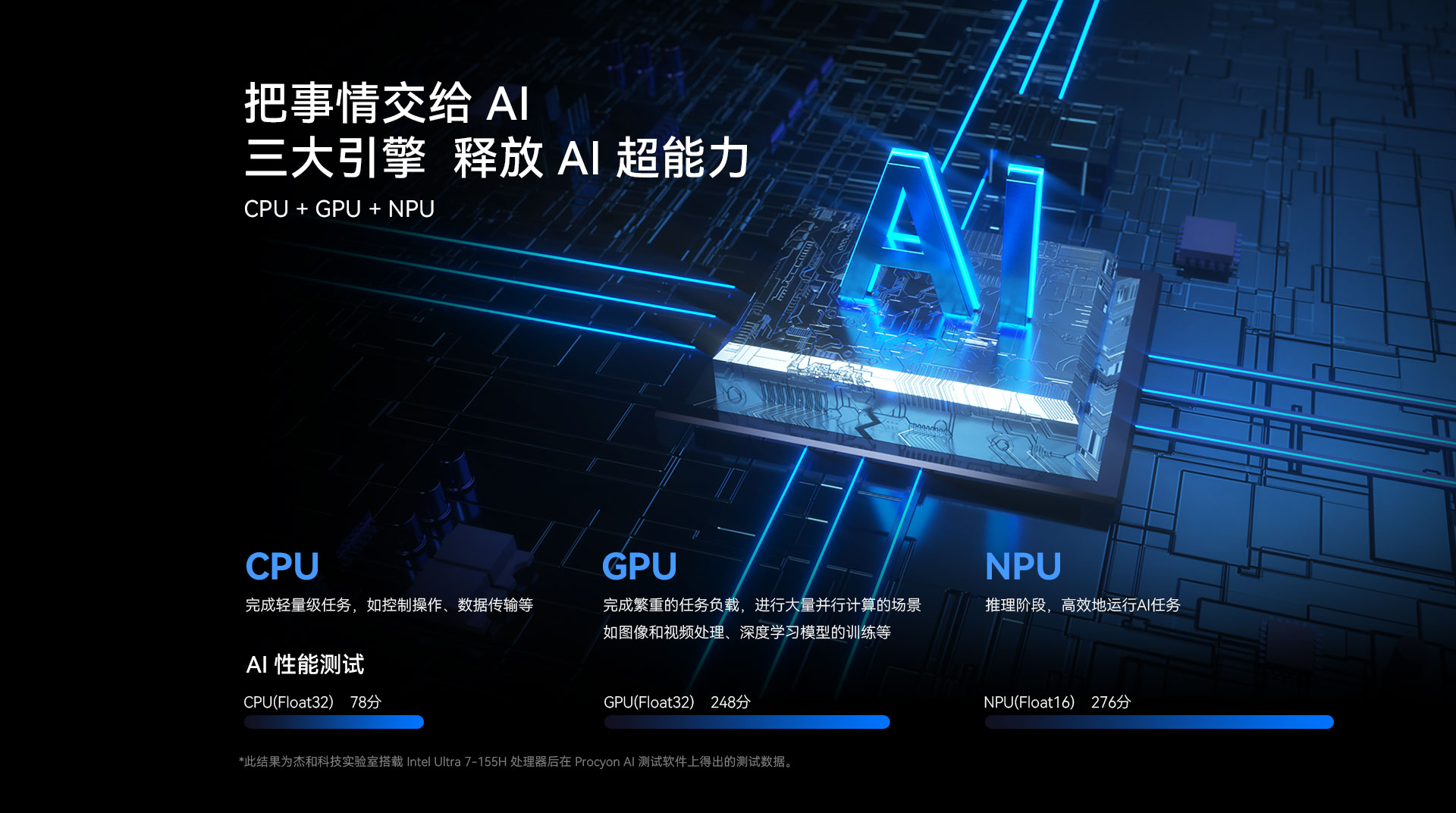 非凡娱乐-电子娱乐科技N601搭载了Intel® Core™ Ultra处理器,可选配Ultra 5- 125H或Ultra 7-155H,全新架构拥有CPU、GPU 和NPU配置。在非凡娱乐-电子娱乐科技实验室里,非凡娱乐-电子娱乐专门用 Procyon AI 这款 AI 性能测试软件对搭载了 Ultra 7-155H 处理器的 N601 进行了测试。最后测试结果显示,N601的CPU分数为78分,GPU 分数为248分,NPU分数为276分,这意味着N601在AI处理方面具有显著优势,能够高效地处理复杂的神经网络计算任务。