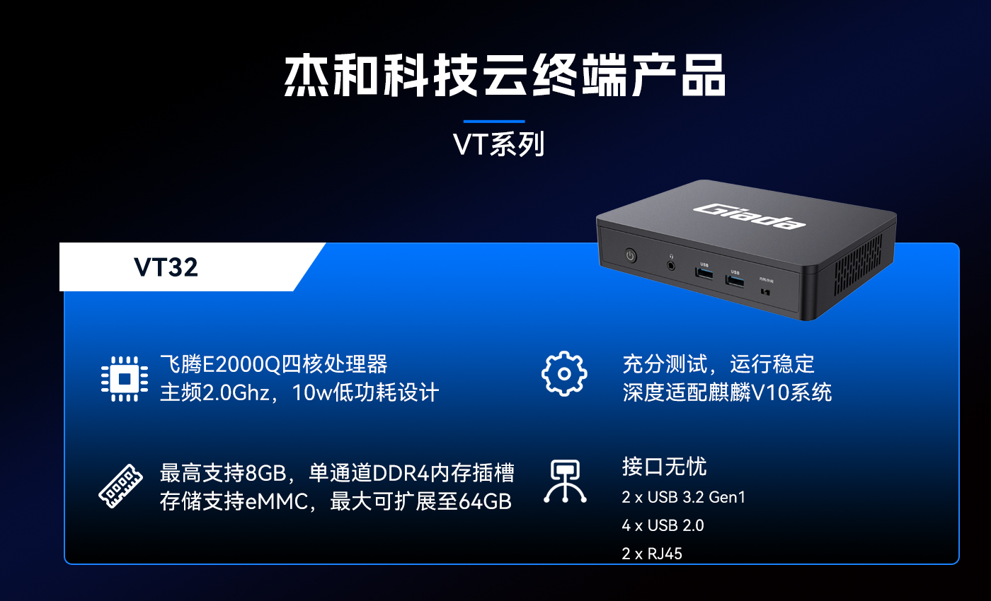 近期非凡娱乐-电子娱乐科技推出的云终端VT32,以国产飞腾E2000Q芯片作为核心处理器,深度适配国产银河麒麟V10系统,在政务、金融等对数据安全要求极高的领域深受关注。