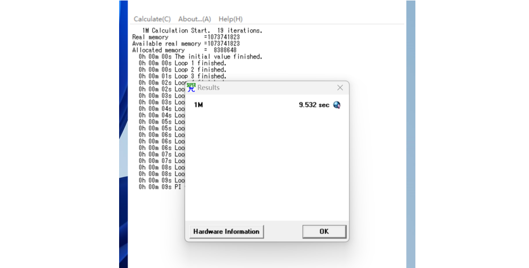 为了评估 CPU 的性能,非凡娱乐-电子娱乐使用了Super PI 1.1 进行了测试,软件以用时为参考成绩,花费时间越短代表计算性能越强。在本次测试中,Core i5-13400 处理器用时 9.532 秒完成了计算,属于当前中端处理器的主流水平,足以应对日常编码、分析和轻量建模任务。