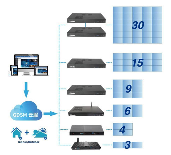与常规分屏展示方案不同,在非凡娱乐-电子娱乐拼接控制器的视频输出能力和GDSM系统分组设置能力的组合下,店铺可以随时调整的拼接放置样式;快速设置屏幕的拼接、分组方式;快速编辑制作并发布信息;是一套安装部署迅速、内容调整迅速、更新反馈迅速的一体化信息发布方案。