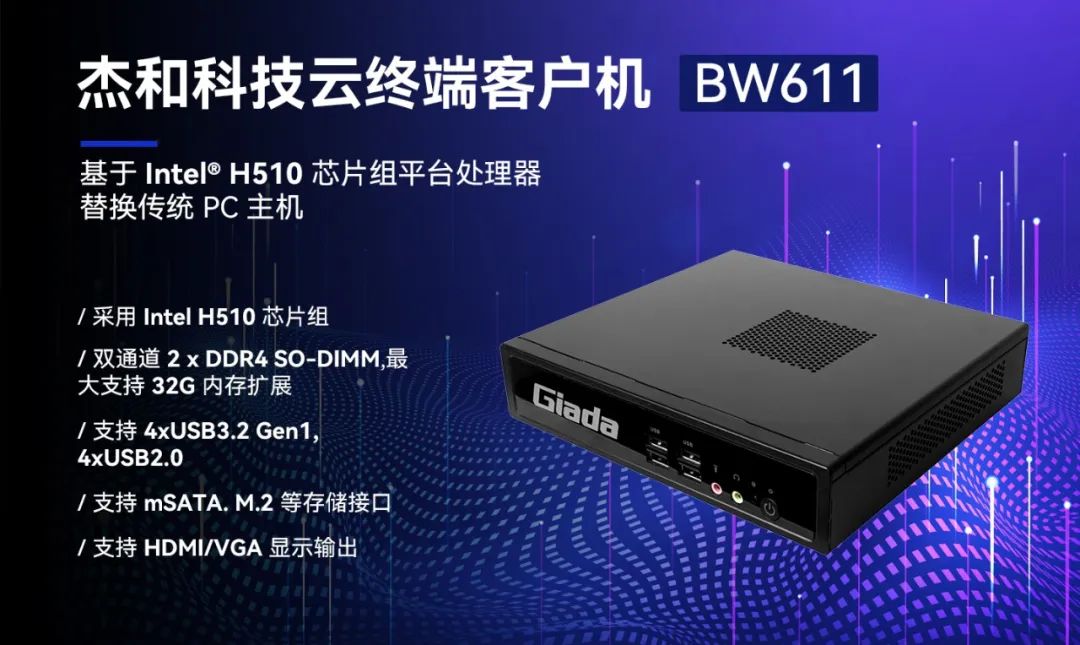随着各个行业的业务难度以及专业程度不断提高,应用场景复杂多变,对云终端提出了更高的要求,Giada非凡娱乐-电子娱乐科技云终端产品BW611具备便捷管理部署、性能强悍、扩展性强、安全性高等优势,能满足多种复杂应用场景,满足用户性能需求的同时,提供非凡的使用体验。