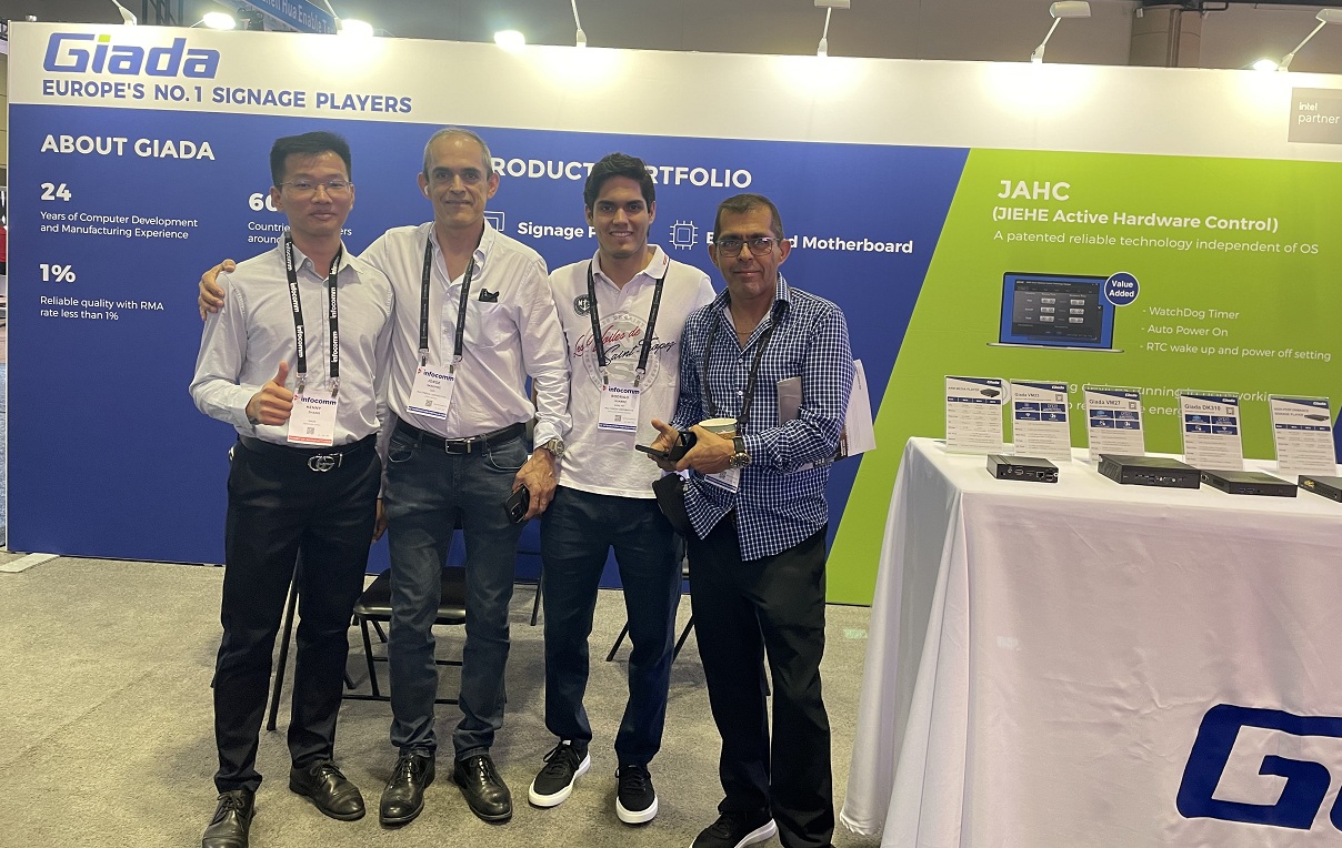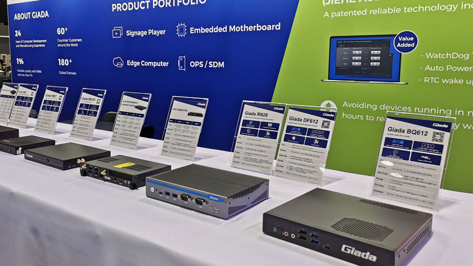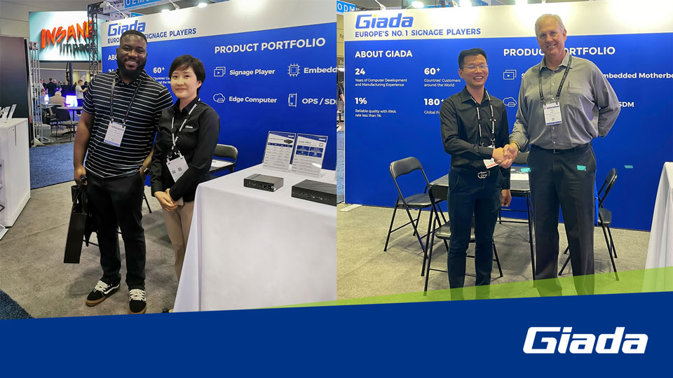展会上Giada非凡娱乐-电子娱乐科技携最新的数字标牌和信息亭应用解决方案以及最新尖端产品惊艳亮相!其中最新的数字标牌播放器、边缘计算机和OPS(开放式可插拔规范)产品在现场备受关注,标志着Giada非凡娱乐-电子娱乐科技互动显示器和智能标牌解决方案领域的重大进步,也向全球参展观众集中展现了公司的非凡实力。