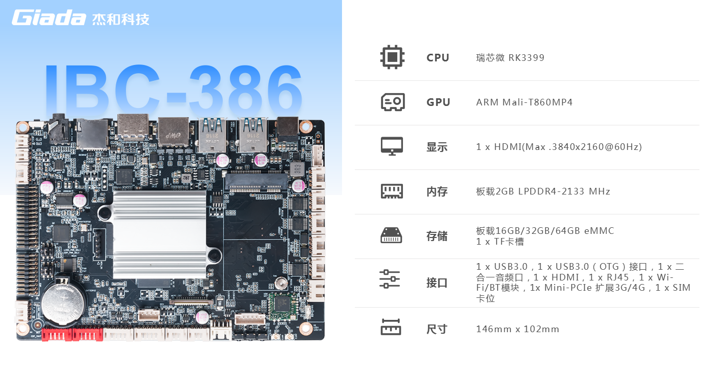 非凡娱乐-电子娱乐科技IBC-386是一款基于ARM架构的3.5英寸主板,采用瑞芯微RK3399处理器(双Cortex-A72大核+四 Cortex-A53小核)六核 64 位CPU。RK3399作为瑞芯微超级扩展全能型旗舰级芯片,GPU采用四核ARM新一代高端图像处理器Mali-T860MP4,具备高性能、低功耗、强大的视觉处理能力的特点。IBC-386板载2GB LPDDR4-2133 MHz内存,板载16GB/32GB/64GB eMMC,支持1x TF卡槽,多种形式轻松扩展存储容量。