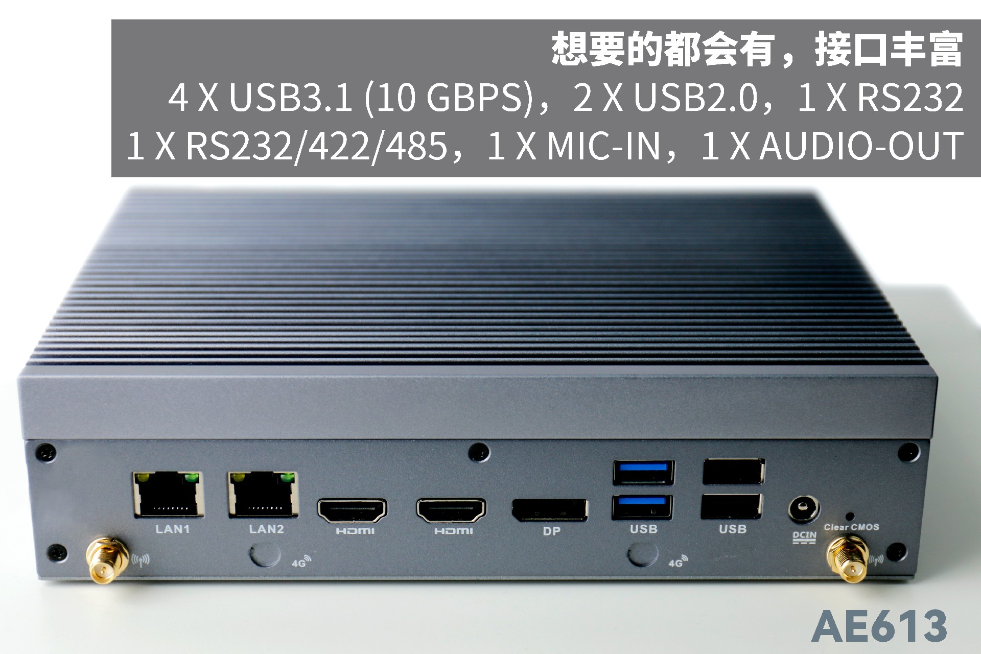非凡娱乐-电子娱乐AE613支持Windows 11 、Linux Ubuntu系统;拥有丰富接口:双千兆自适应RJ45网口,4 x USB3.1 (10 Gbps),2 x USB2.0,1 x RS232,1 x RS232/422/485,1 x MIC-IN,1 x AUDIO-OUT,帮助用户实现更多功能扩展;并且支持Wi-Fi 6E,可以提供更高的带宽和更少的干扰,支持对无线网络有特定需求场景的应用。
