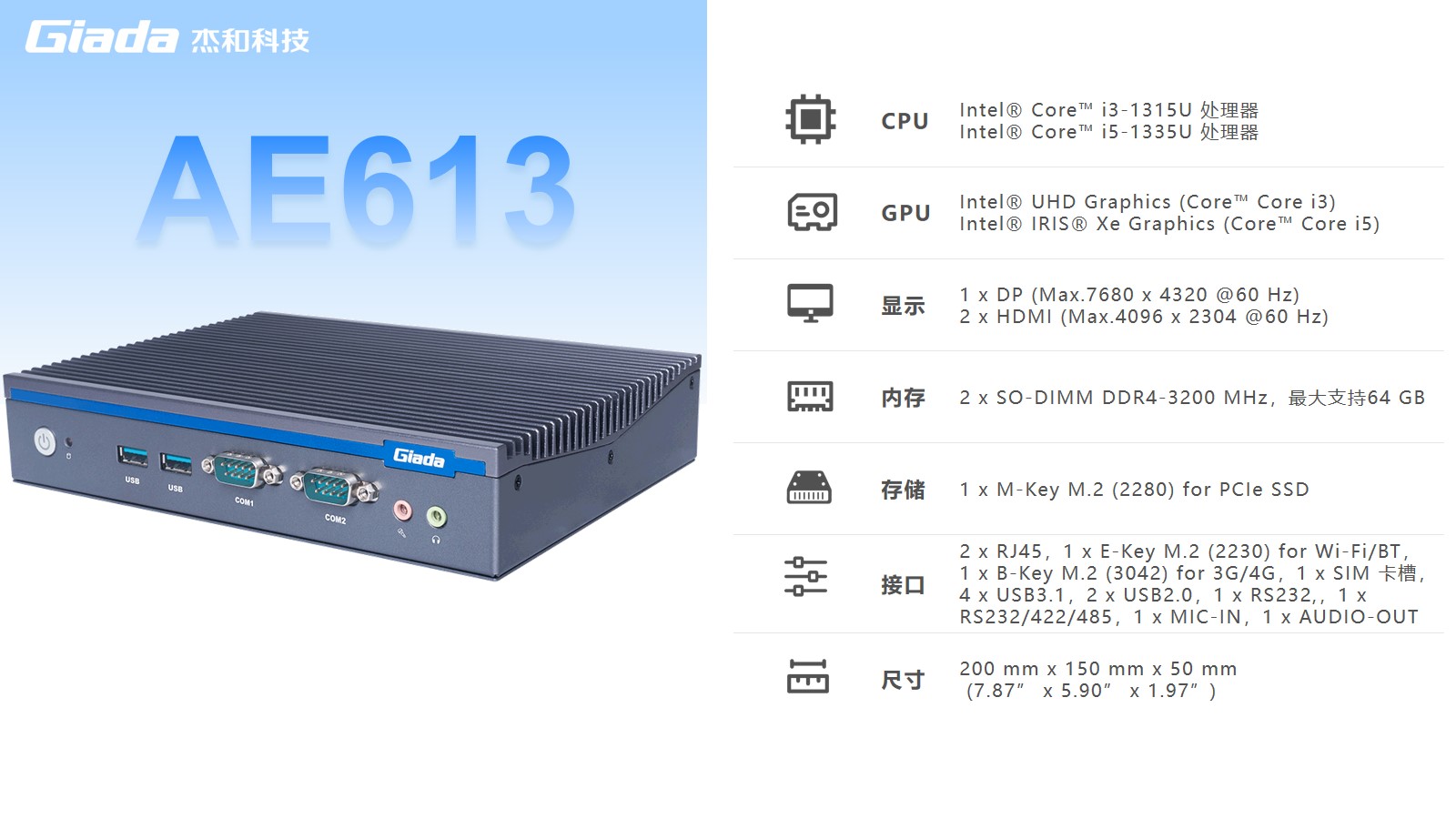 非凡娱乐-电子娱乐AE613拥有2 x SO-DIMM DDR4-3200 MHz内存、1 x M-Key M.2 (2280) for PCIe SSD存储,最大支持64GB,无论是处理复杂的多任务环境、还是运行高负载的软件都游刃有余。