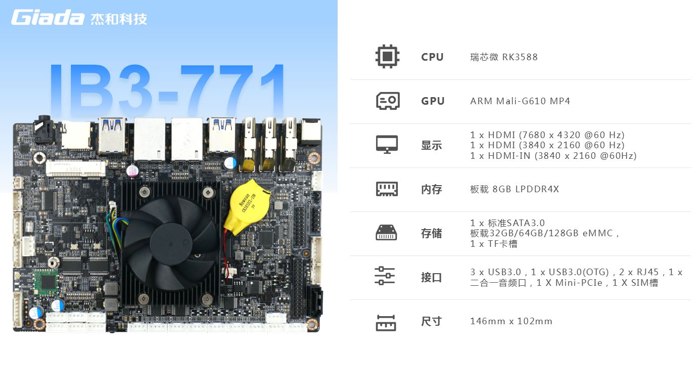 非凡娱乐-电子娱乐主板IB3-771内置瑞芯微新一代旗舰级高端芯片RK3588,6TOPS算力的NPU,具有高算力、内存大、超强多媒体、多重扩展等技术优势。支持主流深度学习框架,能够为各类养老 AIOT 应用场景提供更优的性能表现。